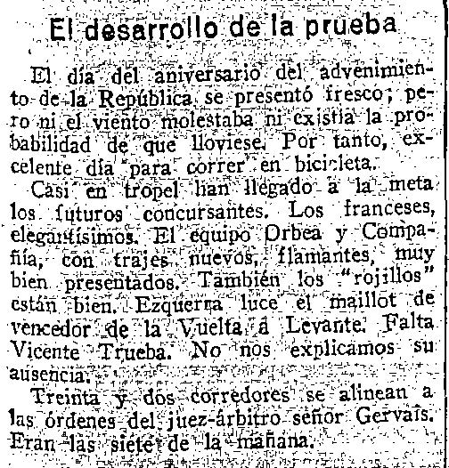 “Este año, además, se inicia la temporada con un aliciente para la afición, que hace años no existía. Recordamos ahora aquel pugilato comercial de Marino Bidaguren, siempre bien recordado en el ciclismo, que oponía su “Dilecta” a la “Helvetia”. Aquella tenacidad en la lucha, que nos asemejaba a lo que ocurre en Francia e Italia, tendrá este año un símil con la batalla sin cuartel que han de disputar las marcas eibarresas “Orbea y Compañia” y “G.A.C.”. Este aliciente, noble e indispensable contribuye a incrementar el negocio, la afición y el interés de los organizadores.